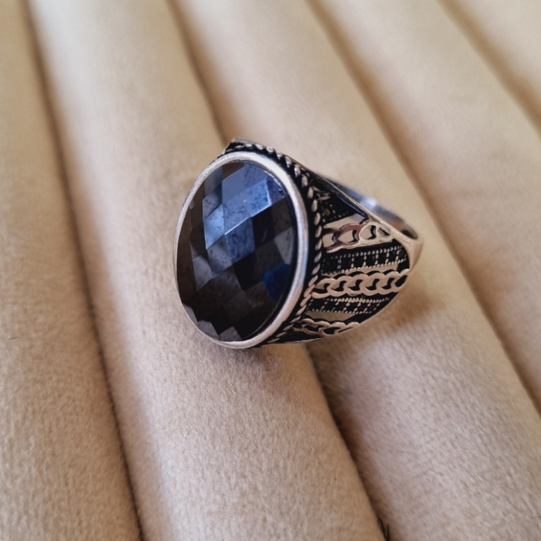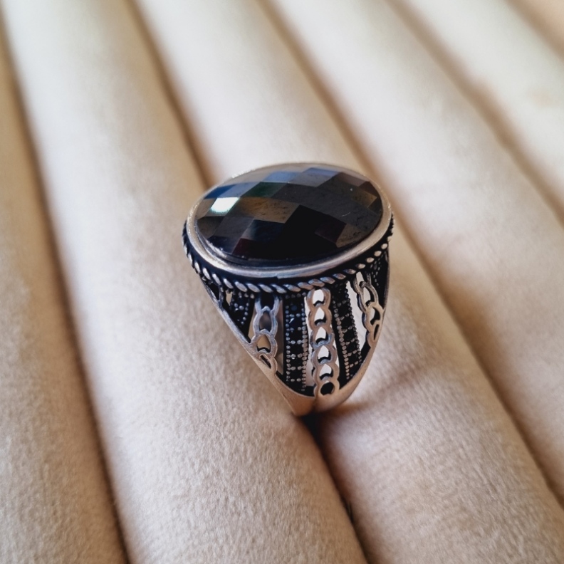 پایه نقره‌ای این انگشتر با دقت و ظرافت بالا ساخته شده تا درخشش خود را در گذر زمان حفظ کند. ترکیب رنگ مشکی سنگ و انعکاس آبی آن، جلوه‌ای خاص و منحصربه‌فرد به دست شما می‌دهد. این انگشتر انتخابی ایده‌آل برای آقایانی است که به ظاهر خود اهمیت می‌دهند و به دنبال اکسسوری‌ای با اصالت هستند.