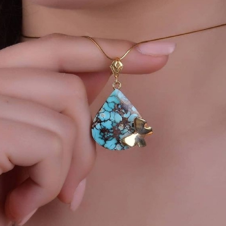 گردنبند فیروزه زنانه کد ۱۵۶۴ ترکیبی زیبا از اصالت و سادگی است؛ اثری کاملاً دست‌ساز که با دقت و ظرافت توسط هنرمندان ایرانی ساخته شده است. پایه این گردنبند از نقره عیار ۹۲۵ تهیه شده و برای افزایش درخشش و دوام، با طلای زرد آبکاری شده است. در مرکز این اثر، یک قطعه فیروزه نیشابوری اصل قرار دارد که جلوه‌ای خاص و انرژی مثبت طبیعی به گردنبند می‌بخشد.