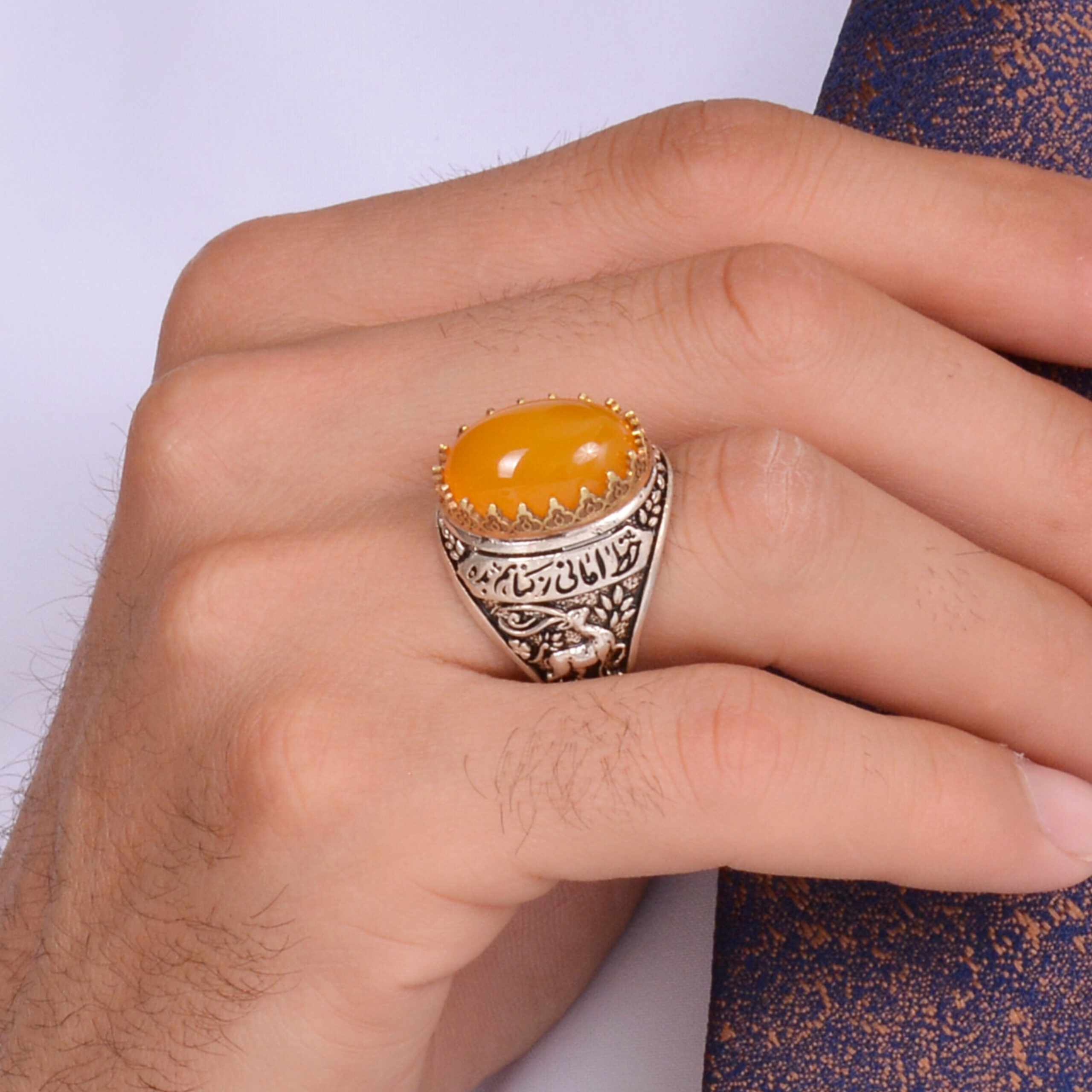 سنگ عقیق زرد اصل و با کیفیت در مرکز انگشتر قرار دارد که قابلیت حکاکی دعای شرف الشمس را دارد و این امر باعث شده این انگشتر، علاوه بر زیبایی، حامل انرژی مثبت و جذب خیر و برکت باشد.