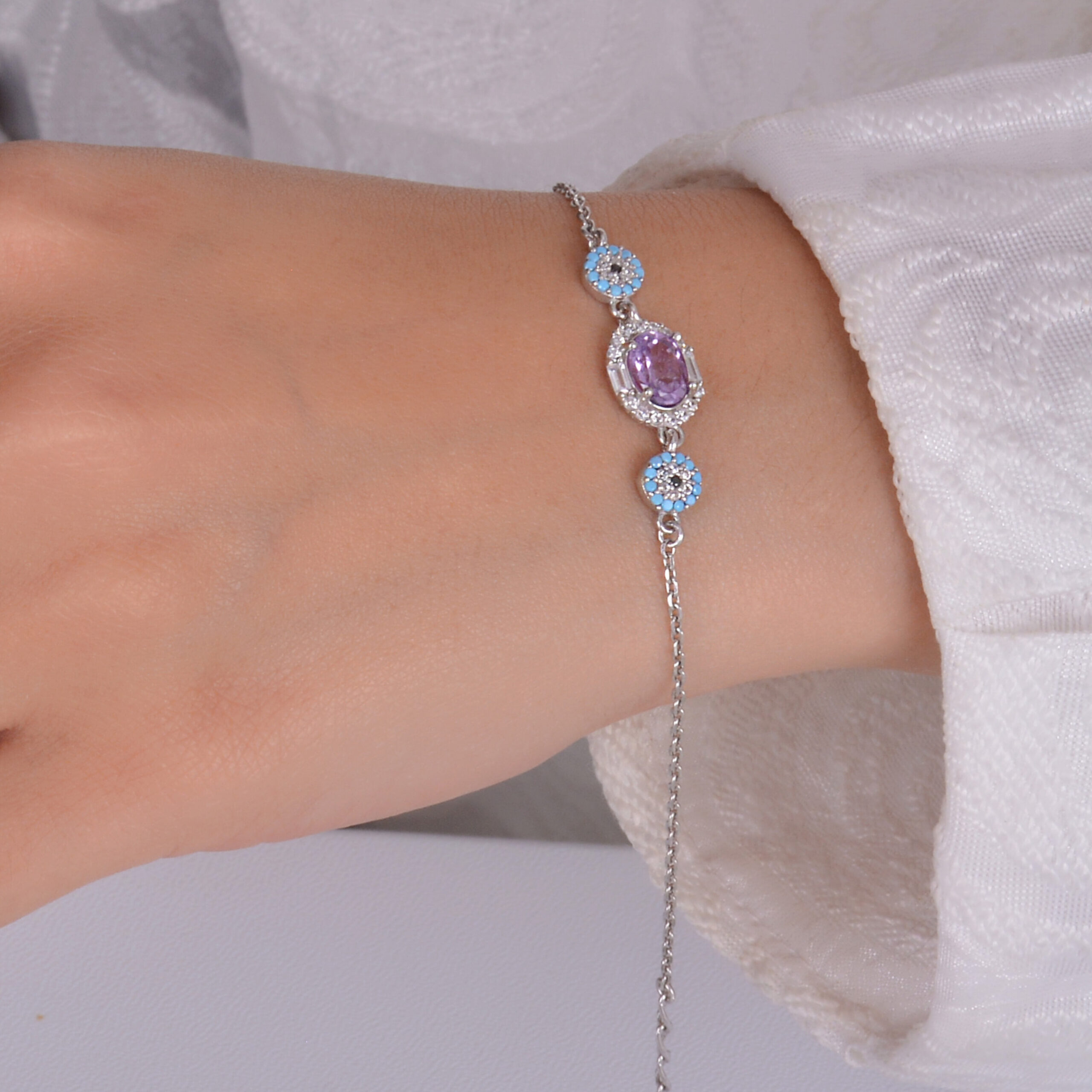 دستبند آمیتیست زنانه کد ۱۵۱۷ با پایه نقره عیار ۹۲۵ و آبکاری طلاسفید